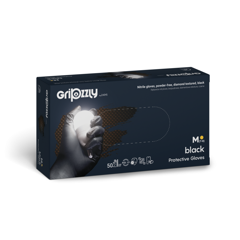 Rękawice Gripzzly wykonane z wysokiej jakości nitrylu, charakteryzują się niezwykłą wytrzymałością oraz grubością, z polimeryzowaną powierzchnią oraz diamentową teksturą na całej powierzchni dłoni i palcach. Wyrób odporny na wirusy, bakterie, grzyby i substancje zawarte w smarach i olejach, dopuszczony do kontaktu z żywnością, przeznaczony do ochrony dłoni przed substancjami niebezpiecznymi.